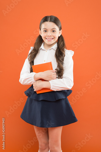 Homeschooling Concept Get Information Form Book Small Girl In School Uniform Diary For Making Notes Schoolgirl Writing Notes On Orange Background Home Schooling For Little Girl Happy Schoolgirl Buy This Stock