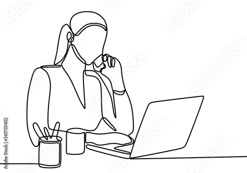 Continuous Line Drawing Of Professional Young Business Woman Using Laptop Depicting Beautiful Girl Work From Home During Pandemic Stock Vector Illustration Of Online Creative