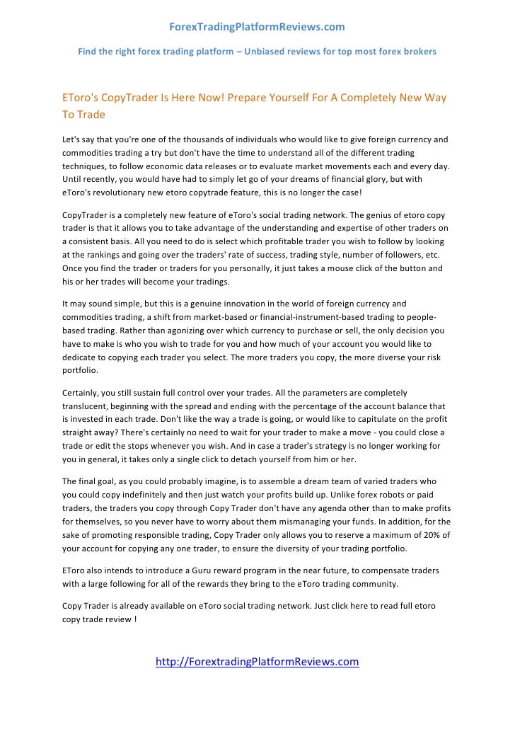EToro is a simple to use and proprietary platform enabling the implementation of copy trading The platform is ideal for traders interested in being copied while following rules for risk control The accessibility enables holders of retail accounts to copy the trading strategies and trades of extremely successful clients both in realtime and. So if a trader bought a SPY ETF which follow SP500 he would beat a return of all but 1 PI on Etoro He would beat a most copied PI by 300% without any effort on his part 1. EToro’s awardwinning CopyTrader technology is a game changer in the industry, enabling anyone to trade like a top trader When they trade, you trade Whether you’re a beginner learning the basics or you simply don’t have time to watch the markets , now it’s easy to leverage other traders’ expertise.