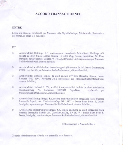 Document Voici L Accord Transactionnel Entre L Etat Du Senegal Et Arcelor Mittal