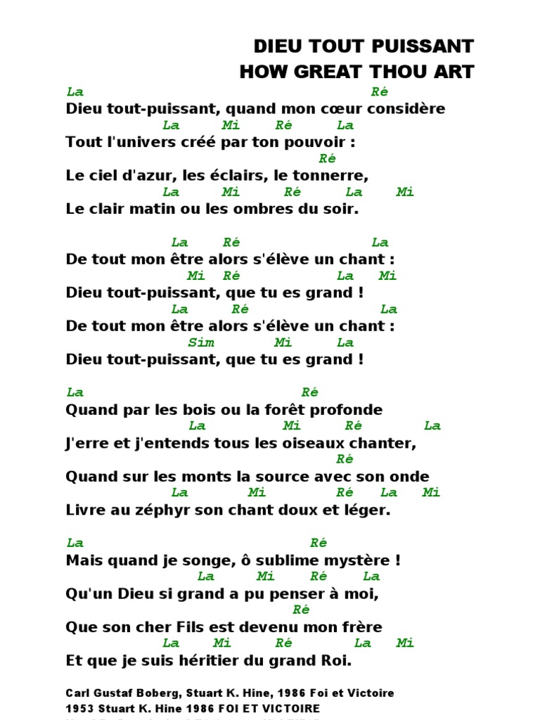 1 Dieu tout puissant, quand mon cœur considère Tout l'univers créé par ton pouvoir Le ciel d'azur, les éclairs, le tonnerre, Le clair matin ou les ombres du soir {De tout mon être, alors, s'élève un chant "Dieu tout puissant, que tu es grand. Dieu tout puissant quand mon coeur considère est un très beau chant de louange louange inspiré du psaumes 8 Il s'agissait d'une répétition dans le bâtiment d'église des ADD de La Ciotat Les choristes fort sympathiques ont accepté que je prenne cette vidéo d'une interprétation moderne d'un chant dont l'air a vieilli mais pas les parolesJ'ai passé un moment de prière sublime en. Dieu toutpuissant, que tu es grand (anglais How Great Thou Art), aussi appelé Dieu toutpuissant, quand mon cœur considère, est une hymne chrétienneIl provient d'un poème nommé O Store Gud écrit en 15 par le pasteur suédois Carl Boberg (en), alors âgé de 26 ans La poème a été mis en musique sur une mélodie traditionnelle suédoise quelques années plus tard 1.