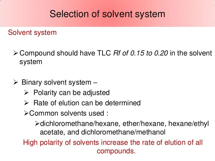 Solvent Systems for Flash Column Chromatography Flash column chromatography is usually carried out with a mixture of two solvents, with a polar and a nonpolar component Occasionally, just one solvent can be used The only appropriate onecomponent solvent systems (listed from the least polar to the most polar). Neues Flash Chromatographie System Varian bietet jetzt auch Lösungen für die schnelle chromatographische Aufreinigung mit Flash Chromatographie an Das IntelliFlash 310 System ermöglicht Aufr. The CombiFlash EZ Prep offers streamlined Flash and Prep HPLC chromatography in one compact, easytooperate unit With just two clicks, users can switch from prepurifying samples on Flash to generating submissionquali ty compounds on Prep HPLC.