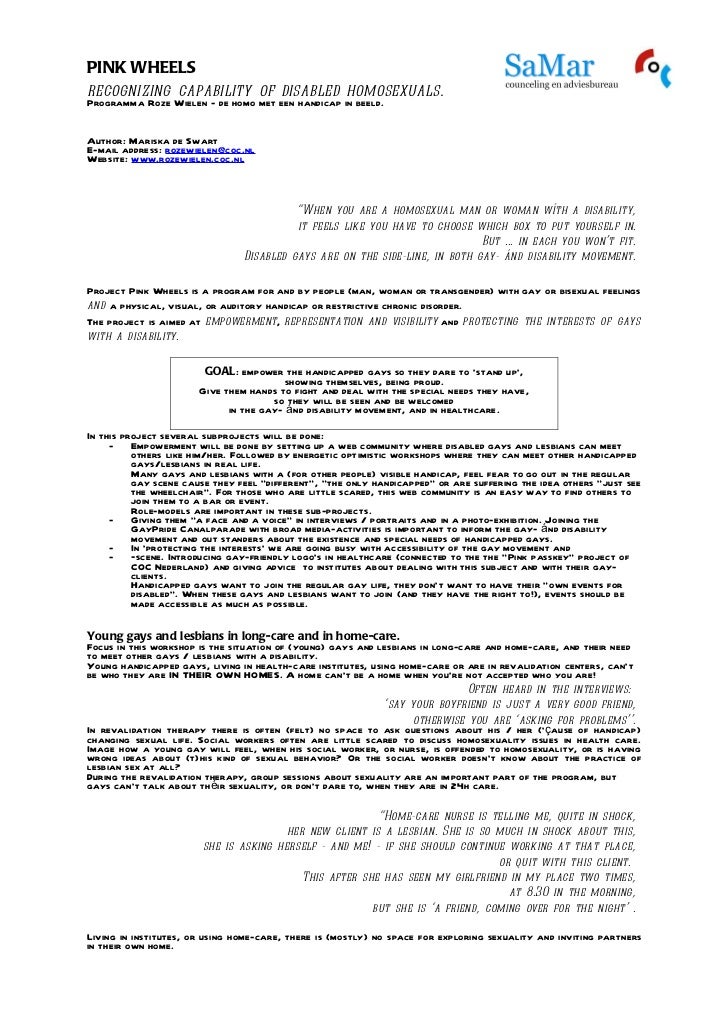 Gay support can help someone dealing with issues anywhere along a continuum from the point where they are questioning their sexuality through dealing with the challenges of possibly coming out at work or struggling with gay relationship issues Support groups for LGBT people often do this through peer support. ‘I’m gay, disabled and still have sex’ He stole the hearts of viewers on last night’s First Dates Ireland TV show and since then it’s been a bit emotional for Dubliner Paddy Smyth. Related Images disability wheelchair disabled nurse handicapped 194 Free images of Handicap 128 140 45 Wheelchair Disability 171 155 28 Hospice Care Patient 68 63 36 Wheelchair Disability 7 7 4 Girl In Wheelchair Girl 103 140 24 Heart First Aid Medical 6 6 0 Hospital Ambulance 36 26 6 Sports Football 61 68 18 Wheelchair.