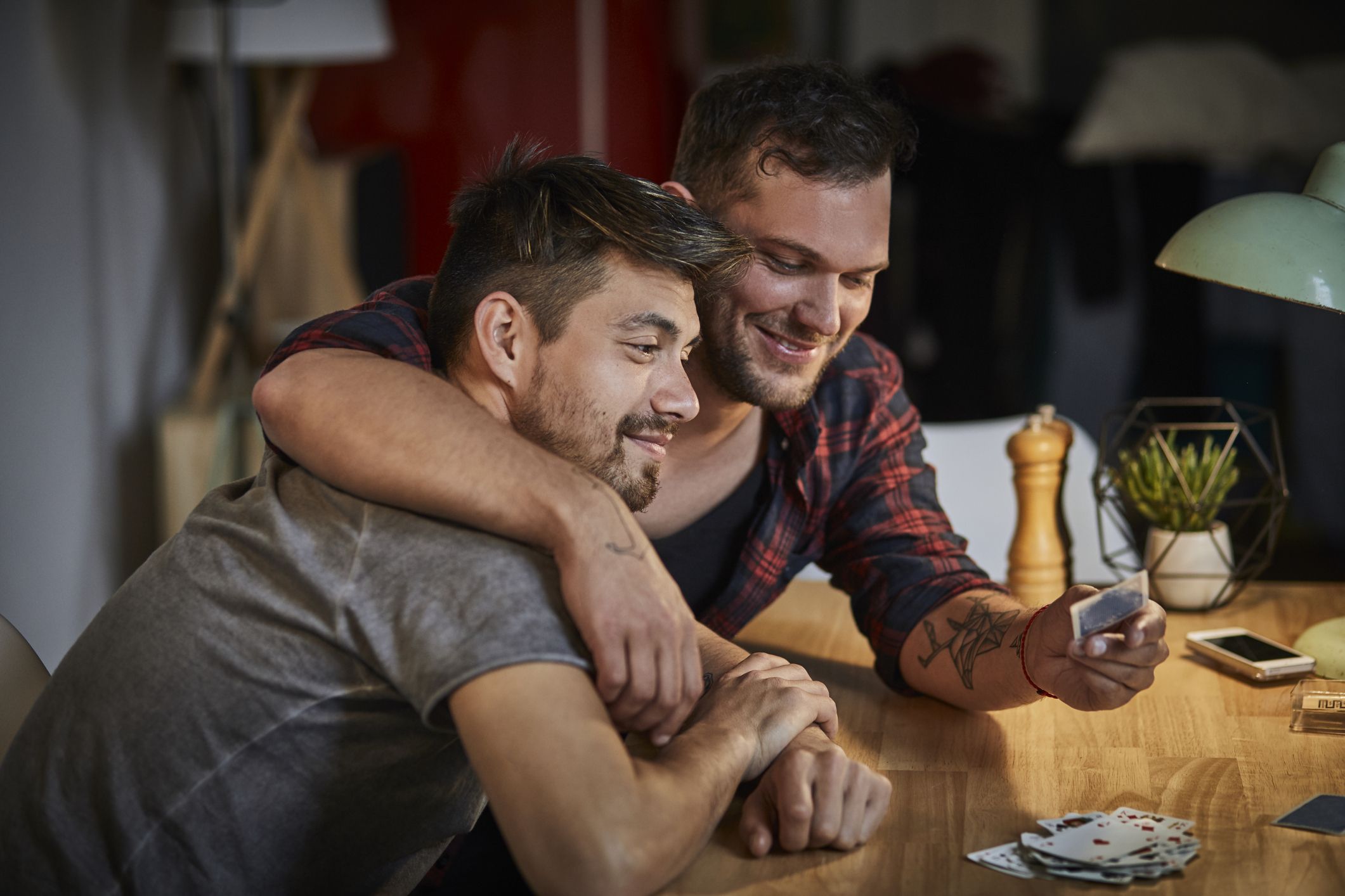 Gay Couple Hugging At Table With Playing Cards Royalty Free Image Coc Midden Nederland
