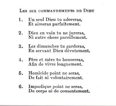 Dieu en vain tu ne jureras, Ni autre chose pareillement 3 Les dimanches tu garderas, En servant Dieu dévotement 4 Père et mère tu honoreras, Afin de vivre longuement 5 Homicide point ne seras, De fait ni volontairement 6 Impudique point ne seras, De corps ni de consentement 7. Commandements de Dieu Commandements de l'Eglise Acte de foi Acte d'espérance Acte de charité Acte de contrition Souvenezvous, ô très miséricorideuse Vierge Petit Catéchisme Dieu Les mystères de la religion Les mystères de la Sainte Trinité Les anges L'homme La chute de l'homme Les Mystères de l'Incarnation et de la Rédemption. » Mgr Boyer, Mandement du 15 août 18, in Catéchisme du diocèse de Clermont (18) Dans son second Catéchisme (quatrième partie), Bossuet fait apprendre les Commandements de Dieu directement en Exode, chapitre XX « Je suis le Seigneur ton Dieu, qui t’ai tiré de la terre d’Égypte, de la maison de servitude.