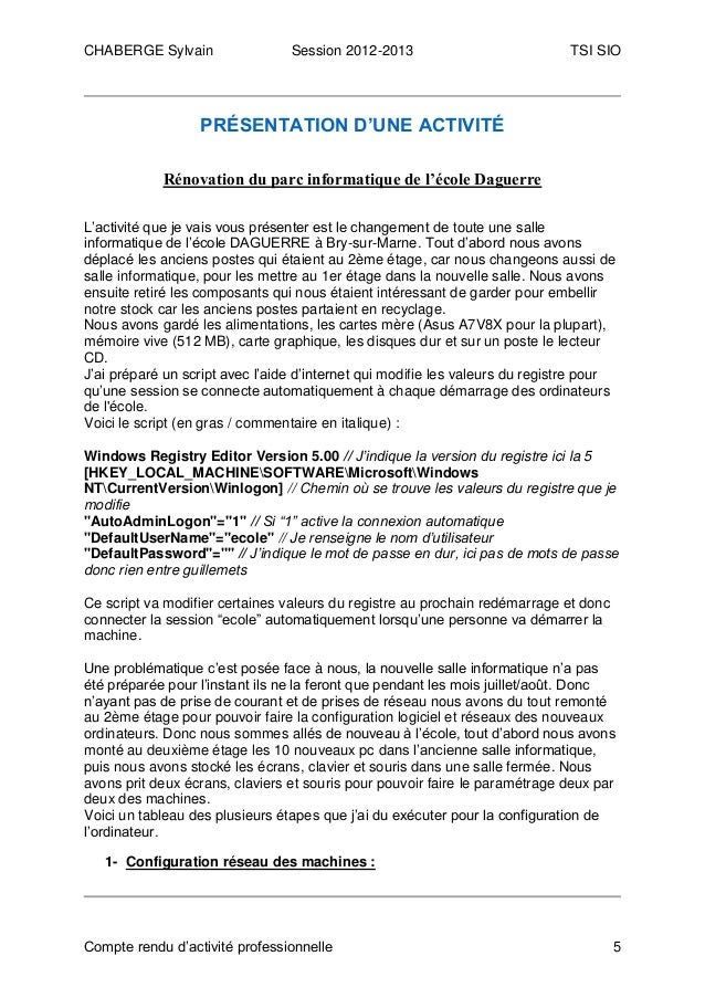 Le compte rendu d’activité vise à faire le point de l’activité passée et future d’une structure à ses garants Par exemple, il peut être établi par la Police municipale à destination du Maire, par des sociétés agréées du Service civique à l’organisme à l’origine de l’autorisation, par un Bureau aux membres d’une association ou par un Syndic à destination des copropriétaires. Certains élèves se sont pris au jeu et ont imaginé de nouvelles manières de présenter leur compterendu de lecture d'où les noms d'élèves sur un bon nombre de fiche Attention !. Compte rendu d'activités en milieu professionnel U62 BTS EEC 13 14 SOKOLOWSKI Benjamin Stage effectué du 06 mai au 28 juin 13 Présentation personnelle Présentation de l’entreprise Marché de l’entreprise Structure de l’entreprise Présentation de l'ensemble de mes.