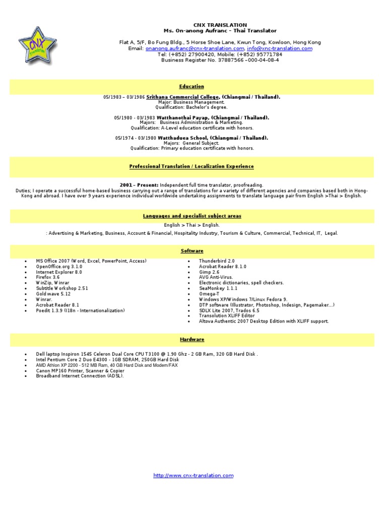 Cv On Anong Aufranc Thai Translator Hong Kong Translations
