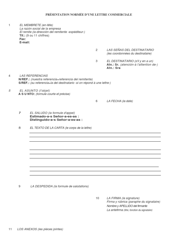 En anglais, les adjectifs vont généralement avant les noms qu`ils décrivent De même, en espagnol, le verbe IR est presque toujours suivi par “a Inversement, les verbes réflexive se produisent lorsque le sujet et l`objet de la phrase sont les mêmes, comme quelqu`un se nettoyant Dans cet exemple, l`objet direct me est et le sujet ESO. Lettre de relance (lettre en espagnol) Vous êtes un founisseur de materiaux et votre client qui a reçu la commande ne vous paye pas dans les délais convenus dans les conditions de vente vous lui envoyez une relance Dernère mise à jour 19 Juin 07. Les exemples sont en français, mais les conseils peuvent s’appliquer à une lettre en espagnol Il ne reste plus qu’à dire adiós 8 Utiliser une formule de politesse en espagnol En français nous sommes tous familiers avec la formule « dans l'attente de votre réponse, veuillez agréer mes salutations distinguées ».