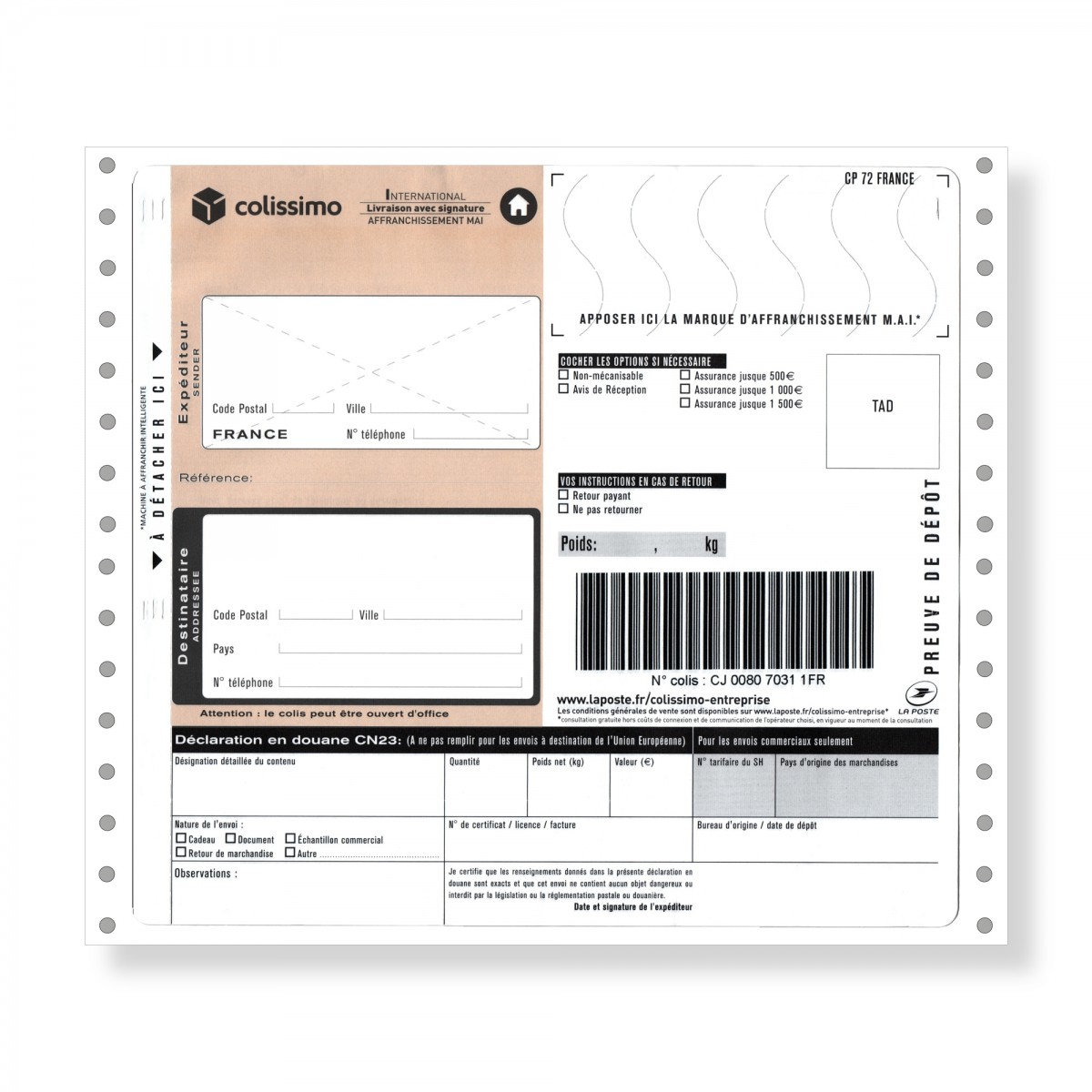 Papiers d’accompagnement Courrier international Etablir l’étiquette douanière, la déclaration et les étiquettes Connectezvous ici pour profiter immédiatement de toutes les possibilités pour les documents d'accompagnement. Title PDF 13 Author Edipro Groupe Subject Normalisation/Sécurisation Created Date 4/23/13 249 PM. To obtain an export tax receipt, a hard copy of the CN 23 customs declaration must be kept by the sender and validated by the date stamp provided by La Poste See Appendix A for an example III3 CN 23 with incorporated CN 11 copy If using a Colissimo Domicile product with or without signature OM (7A / 7Q / 8Q /.
