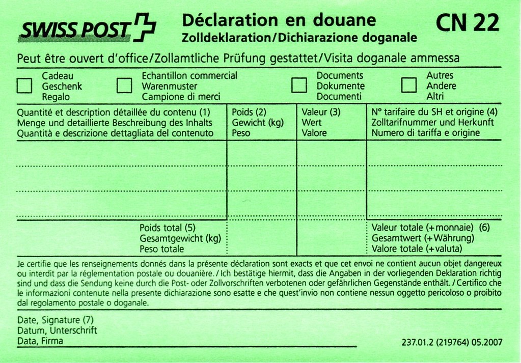 Pour l’envoi de vos colis vers l’Union Européenne, aucune formalité douanière n’est nécessaire Par contre, l’envoi de vos colis vers le reste du monde requiert certaines formalités douanières spécifiques les formulaires CN22 ou CN23 à retirer en bureau de poste Si votre ecommerce s’internationalise, ce guide vous sera utile afin de passer la douane sans difficulté. Si la valeur de la marchandise est supérieure à CHF , utilisez la déclaration en douane CN 23 Bon à savoir Si vous ne souhaitez pas indiquer la valeur de l’envoi (p ex s’il s’agit d’un cadeau), vous pouvez utiliser une déclaration en douane CN 23 à la place de la déclaration en douane CN 22. Conseils pour remplir la partie CN23 • Veuillez de préférence remplir le bordereau d’expédition en anglais ou en français (2 langues internationales reconnues dans le monde postal) • Veillez à remplir pour les envois hors UE l’intégralité de la partie CN 23 (incluse dans de manière complète et lisible.