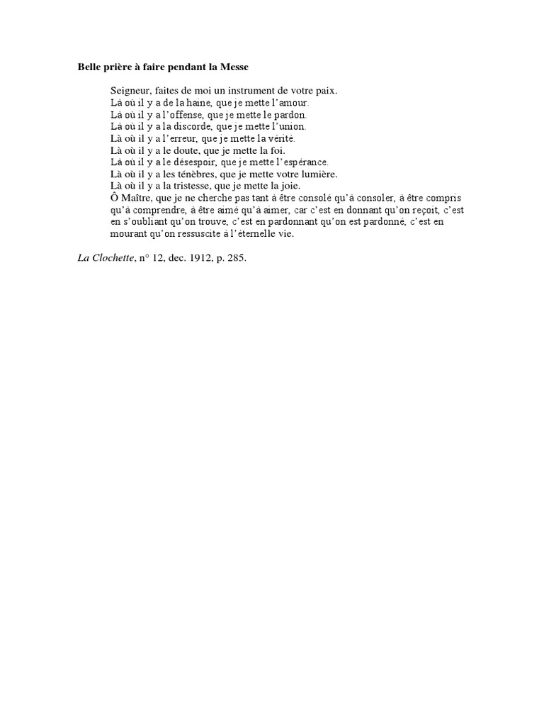 Belle prière à faire pendant la Messe Seigneur, faites de moi un instrument de votre paix Là où il y a de la haine, que je mette l'amour Là où il y a l'offense, que je mette le pardon Là où il y a la discorde, que je mette l'union Là où il y a l'erreur, que je mette la vérité Là où il y a le doute, que je mette la foi. En ce qui concerne le chrétien, sa prière n’est plus, comme pour le non chrétien, disons occasionnelle ou motivée par des circonstances périlleuses, mais elle belle est bien le reflet de sa vie nouvelle en Christ. Prière à l'Esprit Saint Esprit du Seigneur, Viens me donner ton souffle de vie, Car en moi, tout est triste, tout est mort Il m'arrive des fois de manquer de souffle, Je ne sais pas avancer, où aller, Je ne sais pas quoi faire, Je ne sais te prier Viens souffler dans les voiles de ma vie,.