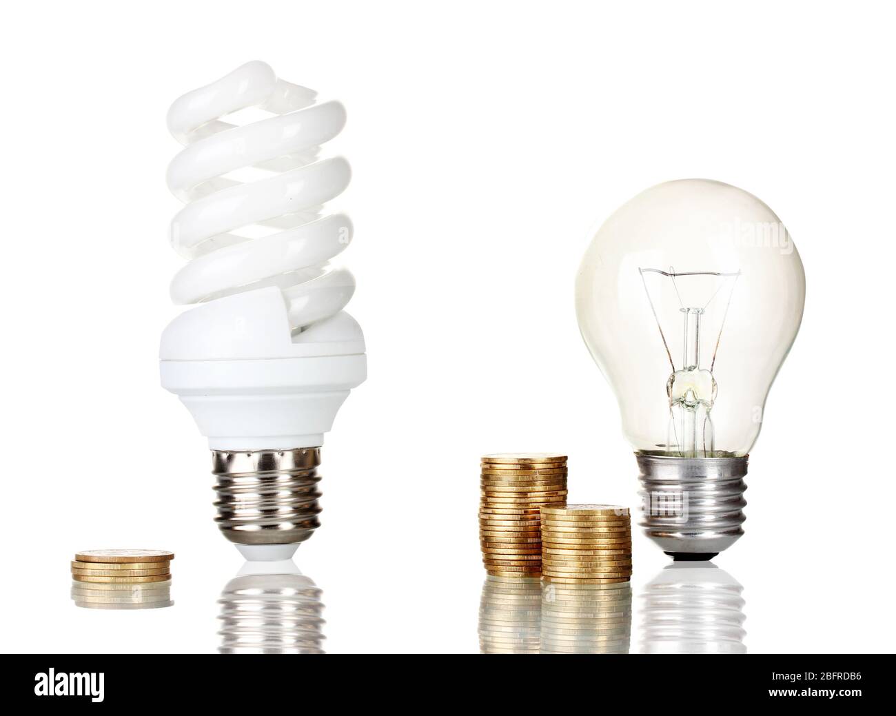 Comparison Of Ordinary Light Bulbs With Energy Saving Lamp Isolated On White Stock Photo Alamy