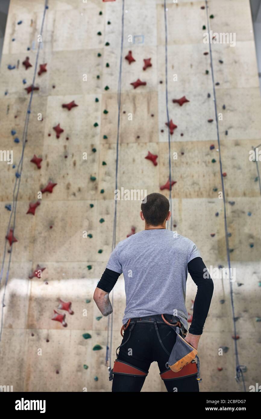Back View Of Strong Athletic Climber With Physical Disability Standing In Front Of High Wooden Rock Wall Ready To Start Climbing Training Well Equi Stock Photo Alamy
