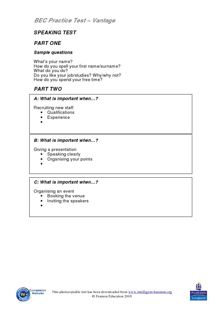 B2 Business Vantage Speaking Part 2 An article by Adrian Doff about the Cambridge English B2 Business Vantage exam (formerly BEC Vantage Business English), speaking part 2 (the 'long turn' task or minipresentation), with tips for preparing candidates and a sample task and explanation. BEC Vantage 2 WITH ANSWERS Examination papers from University of Cambridge ESOL Examinations English for Speakers of Other Languages published by the press syndicate of the university of cambridge The Pitt Building, Trumpington Street, Cambridge, United Kingdom cambridge university press. BEC Tests Intelligent Business is benchmarked with the BEC suite of Business English exams Developed and administered by Cambridge ESOL, the Business English Certificates (BEC) are available at three levels 'Preliminary', 'Vantage' and 'Higher'.
