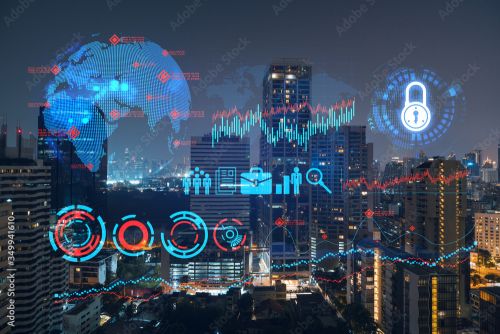 Night Time Cityscape Of Big City View Background With Research And Development Theme Drawing Hologram Data Concept Multiexposure Behang