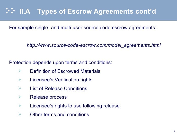 Closing costs are expenses that are over and above the price of the property, like loan application fees, escrow fees, and title insurance Home Inspection Contingency You can choose from our wide array of sample agreement forms, purchase agreement forms, commercial agreement forms, and other types of sample forms and templates to help you. Sample Release Conditions When the source code will be released In drafting an escrow agreement, the release conditions (sometimes called trigger events) are just as important as the escrow materials The occurrence of a release condition entitles the licensee to receive the escrow materials There may be one or more release conditions. The Escrow Agent shall be indemnified and held harmless by the Company from and against any expenses, including counsel fees and disbursements, or loss suffered by the Escrow Agent in connection with any action, suit or other proceeding involving any claim which in any way, directly or indirectly, arises out of or relates to this Agreement, the.