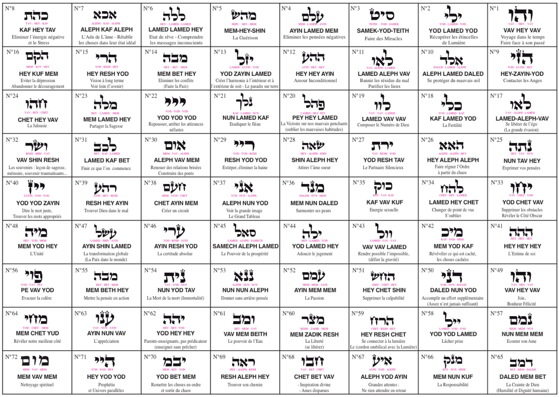 72 Names of God (French) Les 72 Noms de Dieu – The Kabbalah Store Europe. Le Nom de 72 Lettres ou les 72 Anges de la Kabbale Proverbes 1121 Sa Voie est aa = 52, et son secret est Yehoel lavhy = 52, lAnge qui est connu La Vitalité de ihh est yaa = 12, dont le secret est "ceci" zeh, hz = 12, que le père du fils doit assigner au Trône de lAnge de lAlliance. Les 72 noms de dieu La Kabbalah enseigne que chaque être humain partage le même but dans la vie, qui est la joie et la plénitude complètes que Dieu désire pour nous Cela est facile à dire, mais un vrai travail spirituel est nécessaire pour éliminer les tendances négatives qui nous séparent de ces dons de la vie.
