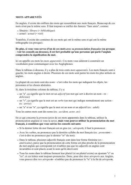 Les mots de liaison, en détail Comment exprimer la cause, la condition, les effets en anglais Comment introduire et conclure une pensée et les mots de remplissage en anglais Comment ajouter une idée, exprimer un but ou un objectif les conjonctions de coordination Comment introduire des idées opposées, des explications et des limites. Selon la linguiste Henriette Walter, les mots d’origine française représentent les 2/3 du vocabulaire anglais actuel Voici quelques exemples de mots ou expressions françaises utilisés en anglais Quelques exemples de mots français que les anglais utilisent dans un contexte différent. 1000 mots AVEC examples les plus utilisés en Anglais;.