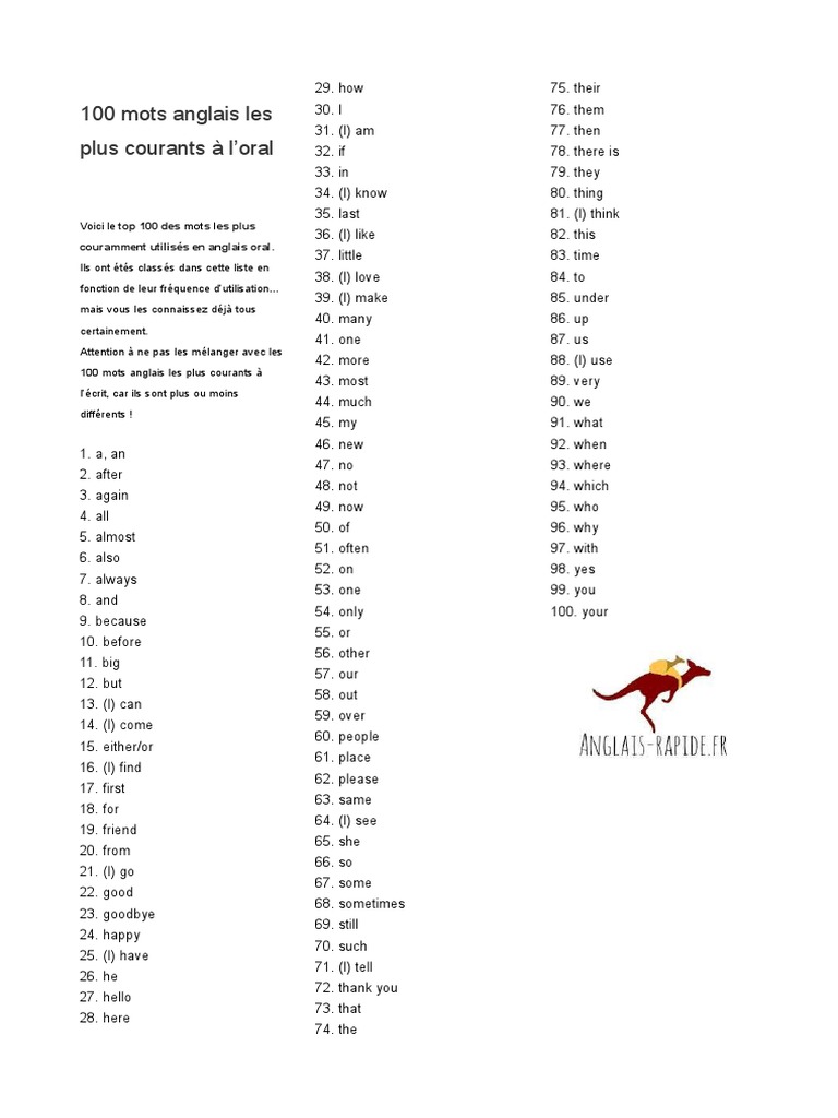 Vous souhaitez augmenter votre vocabulaire anglais mais ne savez pas par quoi commencer Assurezvous d’abord de maîtriser les 100 mots anglais les plus utilisésCes 100 mots représentent 50% des mots contenus dans tous les écrits anglais Si vous êtes partisans du minimum d’effort pour un MAXIMUM de résultats téléchargez ce cadeau sans plus. Les 500 mots les plus utilisés en anglais A1 Les 0 verbes les plus fréquents en anglais Vocabulaire commun au français et à l'anglais Vous présenter en anglais A1 Les formules de politesse en anglais 40 phrases pour faire bonne impression 100 phrases et expressions pour voyager en anglais Les jours de la. De très nombreux exemples de phrases traduites contenant "100 mots les plus utilisés" – Dictionnaire anglaisfrançais et moteur de recherche de traductions anglaises.