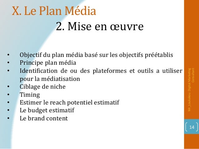 Le plan média, également appelé Media planning jusqu'en 1985 1, est le terme englobant l'ensemble des opérations et études nécessaires à la définition des critères de diffusion publicitaire d'un produit Le plan média est utilisé afin d'atteindre les objectifs de communications visés Ces objectifs, définis au préalable, prennent en compte de multiples critères, tels le coût. Résumé Élaborer un plan horsmédia consiste à faire un savant dosage qui permet d'obtenir et d'activer un maximum de points de contacts avec la cible visée L'utilisation d'actions horsmédia nécessite une parfaite connaissance de sa cible et d'aller à sa rencontre. L'objet de nos actions est de susciter l'impulsivité support par support et non de répondre à une obsession de la cohérence », souligne Céline Motte Flexibilité Le plan média, si précis soitil, constitue avant tout un cadre d'action, a fortiori s'il s'élabore sur le long terme Comme tel, il doit rester le plus flexible possible.