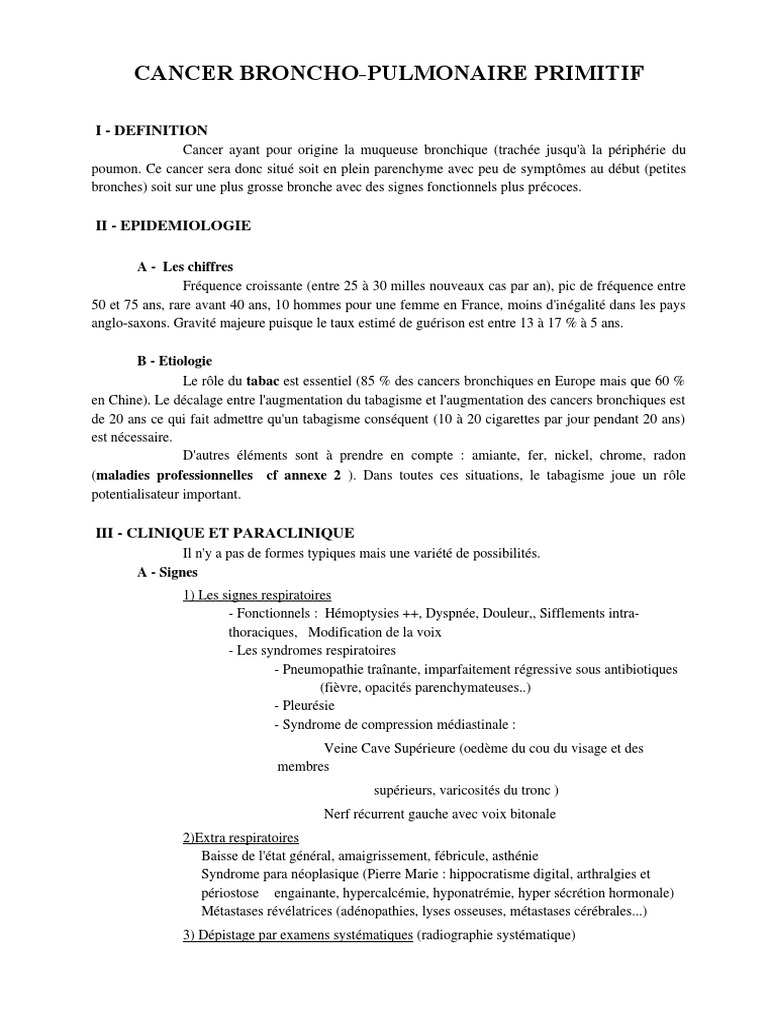 Plus le diagnostic de cancer du poumon est posé tôt, meilleure sera la prise en charge de la maladie et plus grandes seront les chances de survie du patient C’est pourquoi il est important de consulter un médecin dès l’apparition des premiers symptômes. Cours de cancer broncho pulmonaire epidémiologie cancer du poumon symptomescancer broncho pulmonaire primitifcancer broncho pulmonairecancer bronchique non. Le dépistage du cancer bronchopulmonaire a été proposé à tout sujet adr essé aux consultations de pathologie professionnelle de Caen, Cherbourg, Rouen et Le Havre jusqu’au 31 décembre 06.