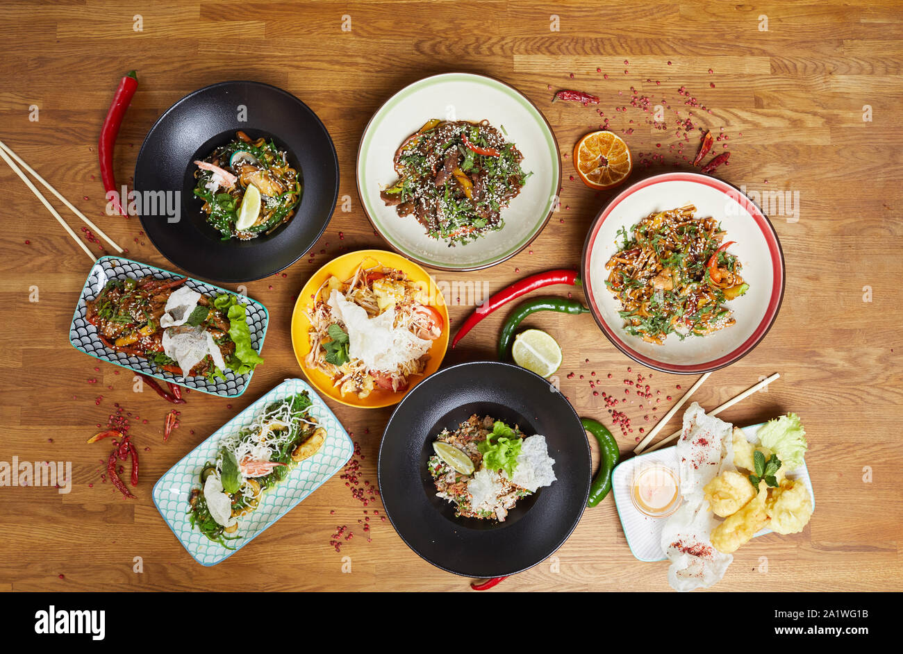 Top View Background Of Beautiful Asian Dishes Set On Wooden Table Decorated With Hot Red Pepper And Lime Copy Space Stock Photo Alamy