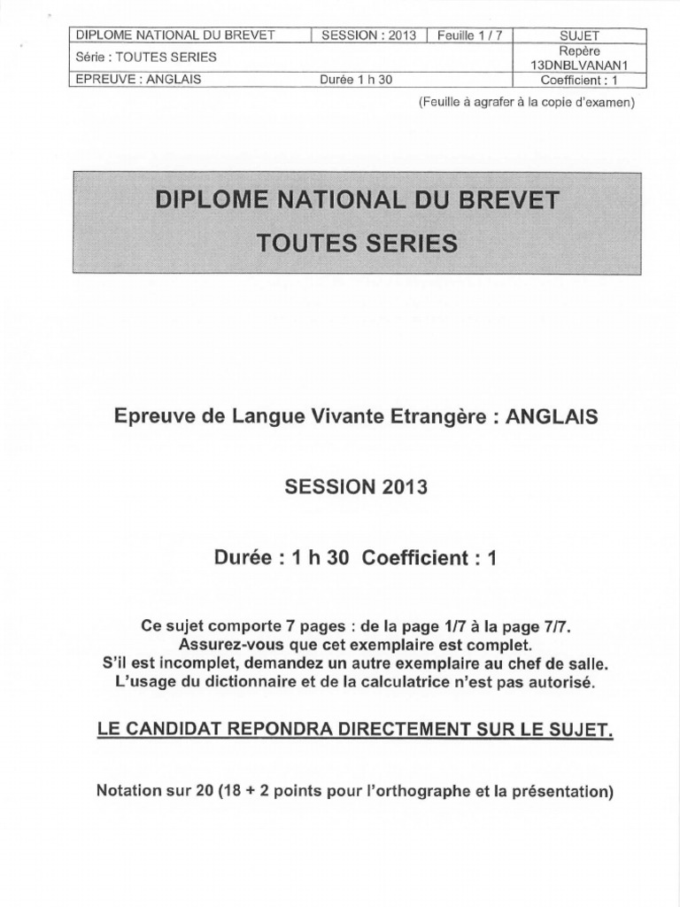 1 Diplome National Du Brevet Session 04 Anglais