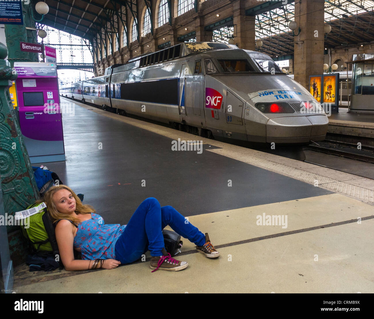 Paris France Les Touristes Voyageant Dans La Gare La Gare De Nord Bullet Train Tgv Sur Le Quai Adolescent Assis En Attente Photo Stock Alamy