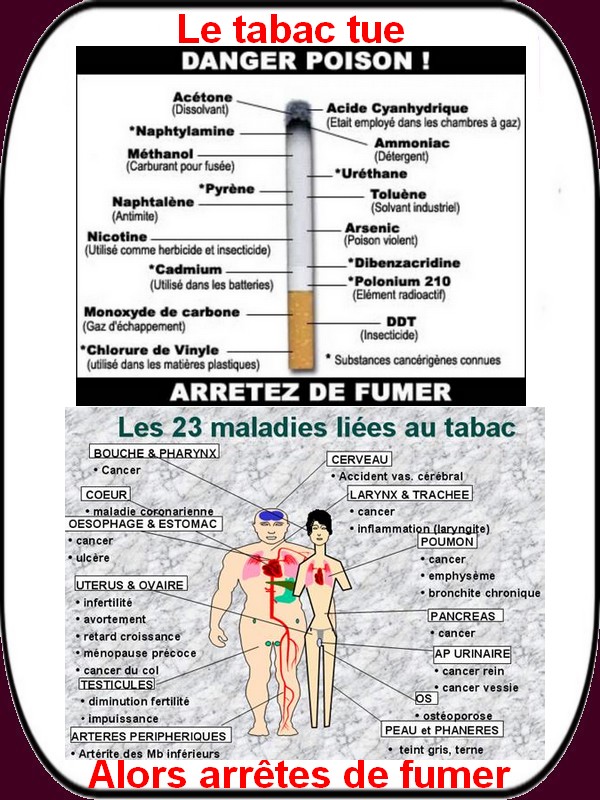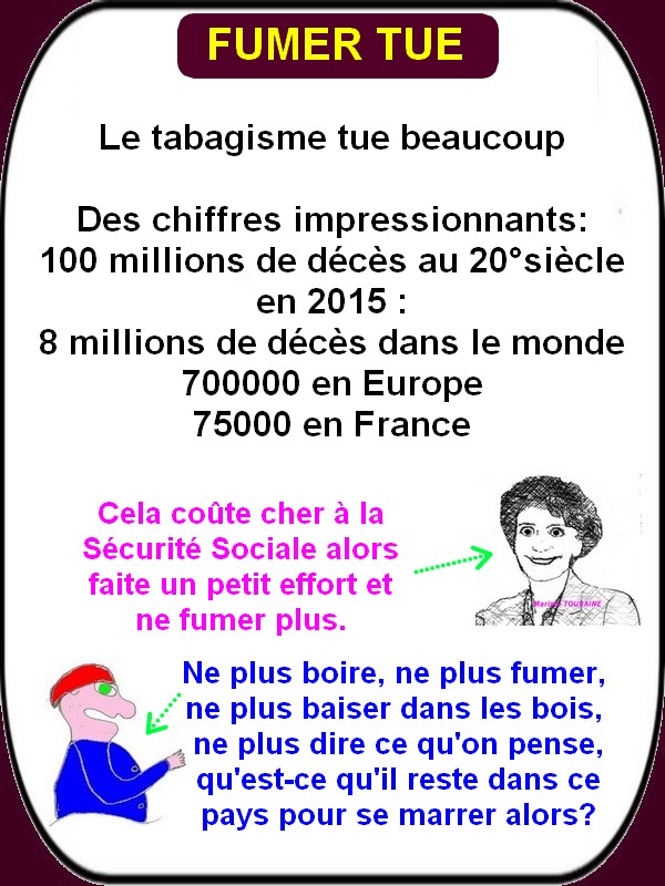 La menteuse attitrée, nous vient la clope au bec, vendre son baratin qui vaut pas un kopeck !. Fumer tue l'environnement L’OMS rappelle que sur les 15 milliards de cigarettes vendues chaque jour dans le monde, 10 milliards sont jetées chaque jour dans la nature Les mégots de cigarette représentent 30 à 40 % des déchets ramassés lors des nettoyages des villes et des côtes. Un fumeur entre dans un bureau tabac, il demande un paquet de cigarette Marlboro Le vendeur lui donne un paquet sur lequel il est mentionné " Fumer provoque l'impuissance".