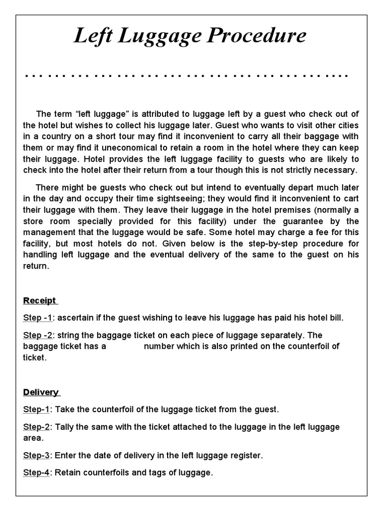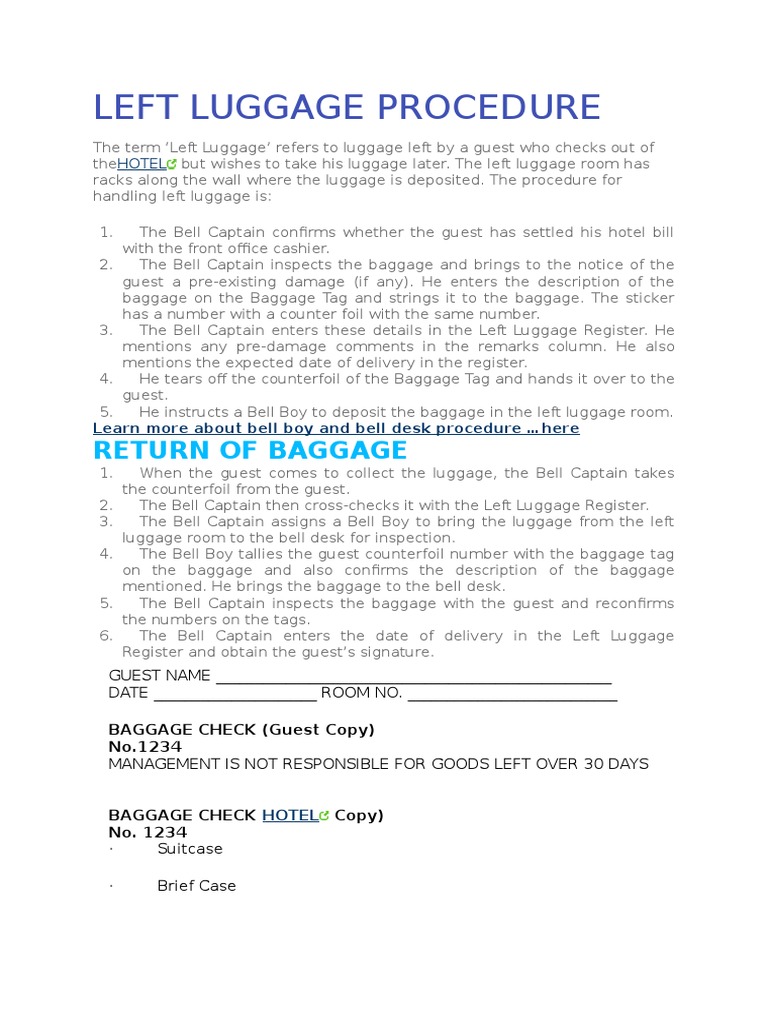 On Guest Departure Luggage Storage Room SOP Bell Desk Guest luggage handling procedure On Guest Arrival 4 Direct Bill authorizations may be kept on file for companies that make large numbers of reservations The credit manager then sends the statement of account to the. Eelway took the worry of transferring our luggage off our hands for a very reasonable fee, and gave us more time to spend exploring Paris The staff met us as arranged, on time, and were very helpful When we come to Paris again we'll definitely use Eelway!. Luggage handling Procedure on guest arrival – FIT, VIP, and Group 56 Luggage handling Procedure on guest Departure – FIT, VIP, and Group 57 Left Luggage procedure 58 Scanty Baggage procedure MODULE 6 RESERVATION CONCEPT 10 HRS 61 Sources and modes 62 Types – Guaranteed & nonguaranteed 63 Reservation Record 64 Method of receiving a.
