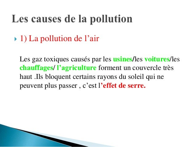 Air pollution is a mix of particles and gases that can reach harmful concentrations both outside and indoors Its effects can range from higher disease risks to rising temperatures. La pollution La pollution est devenue aujourd’hui, une menace pour la vie de l’homme, des animaux et des plantes Quelles en sont les causes, les conséquences et les solutions possibles ?. Un exemple de pollution au sein du lycée ;.