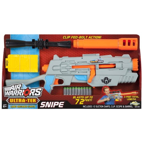 Not to be confused with the Air Warriors Snipe The Snipe is a Buzz Bee blaster that was released in 15 under the UltraTek subseries It comes packaged with a detachable scope, a detachable barrel, an eight dart clip, eight Long Distance Darts, and instructions. Not to be confused with the Air Warriors Snipe The Snipe is a Buzz Bee blaster that was released in 15 under the UltraTek subseries It comes packaged with a detachable scope , a detachable barrel , an eight dart clip , eight Long Distance Darts , and instructions. Get ready for exciting action with the Air Warriors Ultra Tek Predator Suction Dart Blaster Load the projectiles into the clip, pump the handle and pull the trigger to shoot It can hit targets up to 72' away This Air Warriors dart blaster is made with sturdy plastic components and features a vibrant design in an assortment of bright colors.