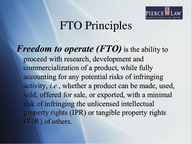 Freedom to operate, also known as FTO or right to use, means you have the freedom to test, market, or sell a product or service in a specific area Sometimes, intellectual property rights only count in a country or a region, and outside of them you have the FTO to do whatever you want. Then there’s “freedom to operate” In that case, you’re asking not “can I get a patent on this”, but “can I do anything with it without infringing someone else’s patents” For FTO considerations,. A Freedom to Operate (FTO) analysis invariably begins by searching patent literature for issued or pending patents and obtaining a legal opinion as to whether a product, process or service may be cons.