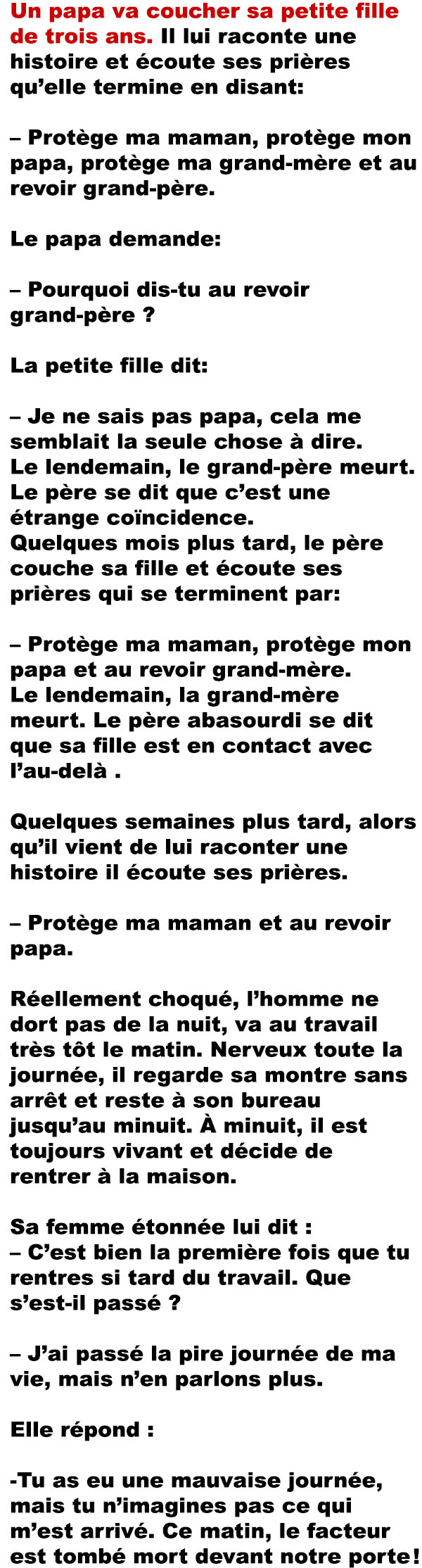 Histoire a raconter a une fille. Le lendemain, la grandmère meurt Le père abasourdi se dit que sa fille est en contact avec l'audelà Quelques semaines plus tard, alors qu'il vient de lui raconter une histoire il écoute ses prières Protège Protège ma maman et au revoir papa Réellement choqué, l'homme ne dort pas de la nuit, va au travail très tôt le matin. Vous voulez une histoire drôle et touchante ?. A raconter aux enfants le soir du 24 décembre L'histoire du Père Noël Il y a bien longtemps, le Père Noël s’installait en Laponie Il rêvait de calme et de verdure Et.