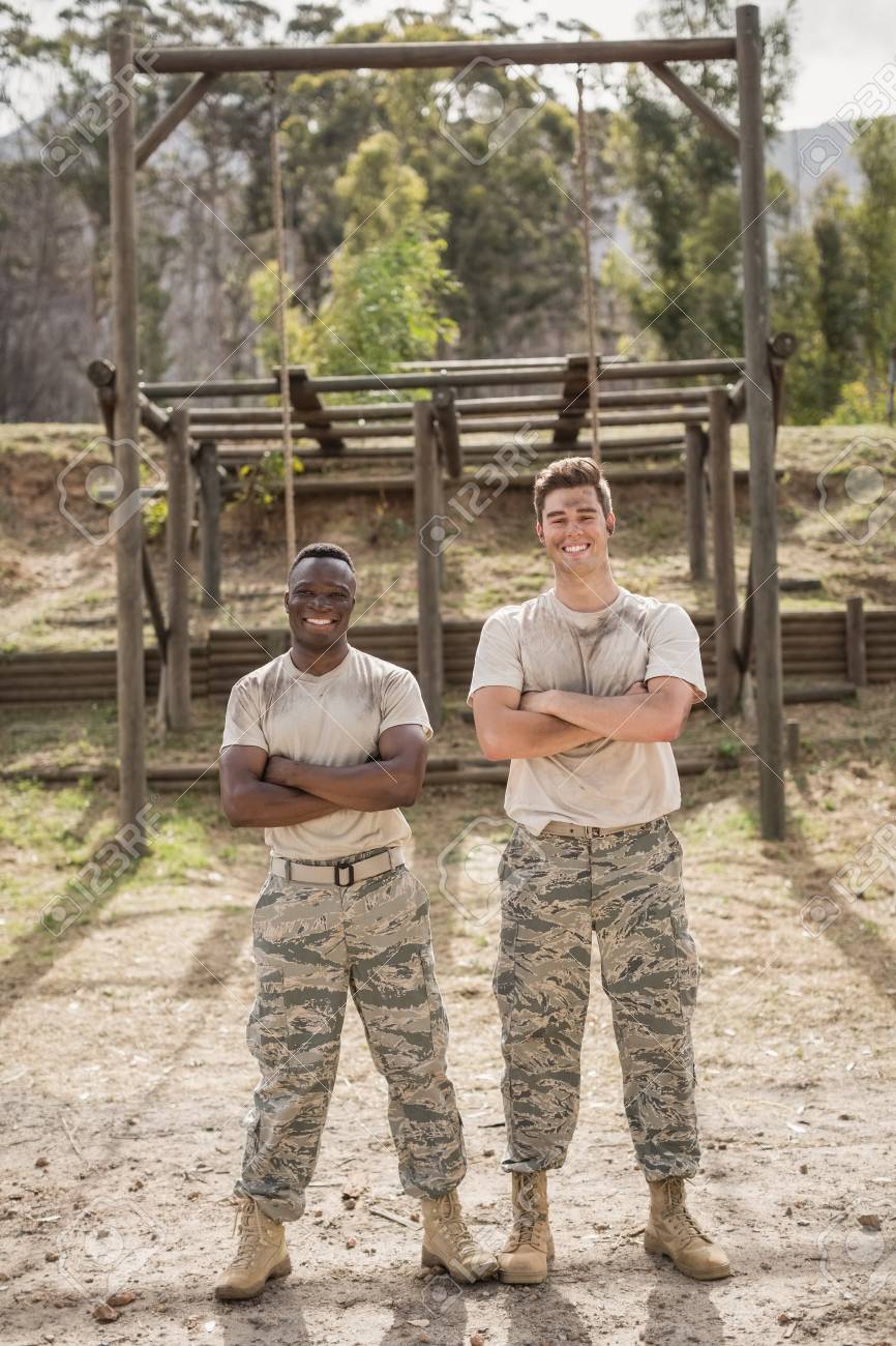 Portrait D Un Homme Militaire Debout Avec Les Bras Croises Pendant Le Parcours D Obstacles Dans Le Camp D Entrainement Banque D Images Et Photos Libres De Droits Image