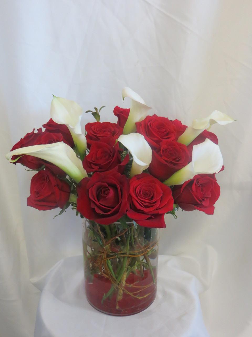 Embrace This Luscious Bouqet Of Red Roses And Calla Lilies