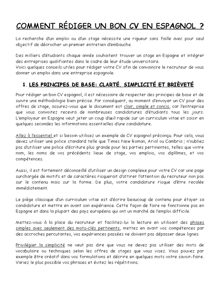 CV espagnol vs CV français quelles différences ?. Traduire ton CV français en espagnol ne suffira pas Il faut respecter quelques règles du modèle espagnol pour augmenter ta crédibilité auprès des recruteurs Le CV espagnol peut faire jusqu’à deux pages au format. Exemple d'un CV espagnol MycvFactory Régis Delanoë Après un Master obtenu à l’Institut d’études politiques de Rennes, Régis Delanoë s’est mis à son compte en tant que journaliste indépendant Multitâche, il travaille depuis plus de dix ans dans le vaste domaine de la presse écrite et web Enquêtes, reportages, interviews et.