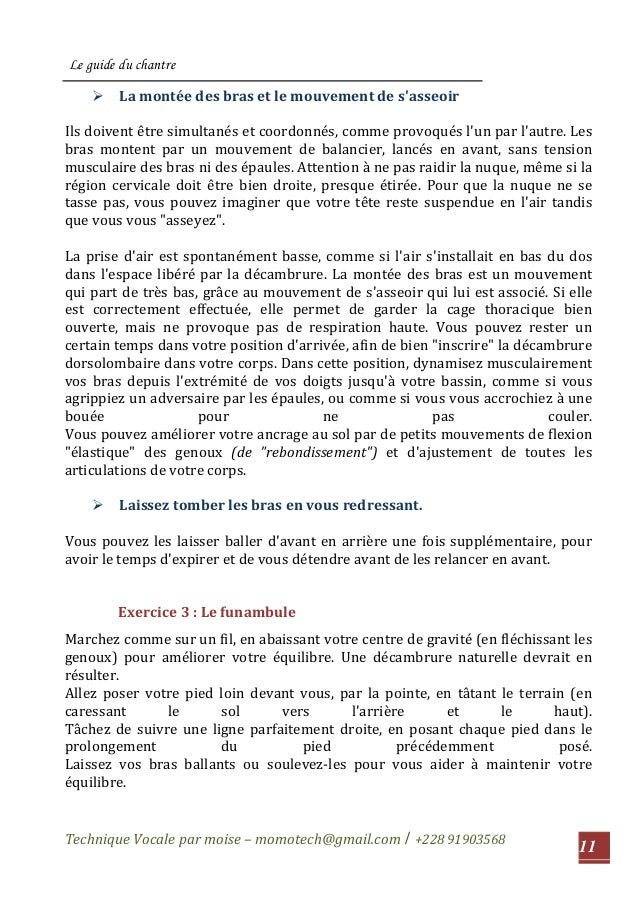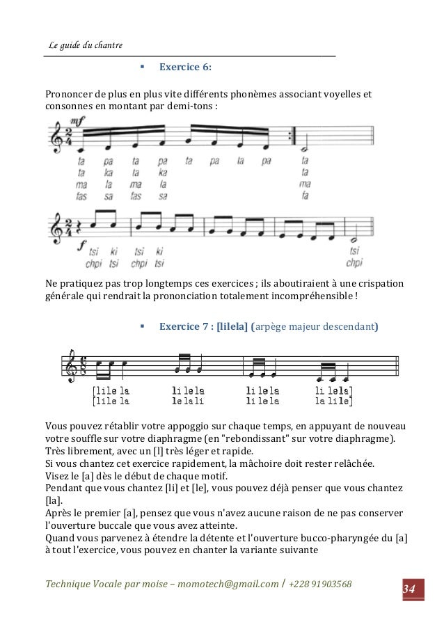 What are vocal warmups for singers?. Exercice vocal 1 Le guide du chantre Technique Vocale par moise – momotech@gmailcom / 228 2 TABLE DES MATIERES Introduction Partie I les exercices physique P526 Chapitre 1 ancrage au sol P1014 Chapitre 2 Ceinture pelvienne P1518 Chapitre 3 Détente de la nuque P19 Chapitre 4 étirement P2122 Chapitre 5 Jeux de respiration et mouvement continu pendant le chant. Vocal Loudness Exercises 1 Take a deep breath and say “AH” in a loud voice Try projecting your voice across the room Hold “AH” for as long as you can Repeat times 2 Glide up and down the musical scales on “AH” or “OOO” Listen for changes in your pitch If it is easier sing the notes using “LA, LA, LA”.